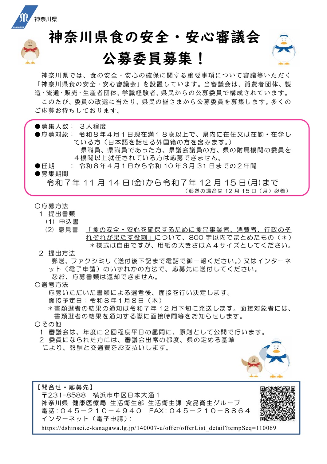 2025年11月11日 神奈川県食の安全・安心審議会 公募委員募集について