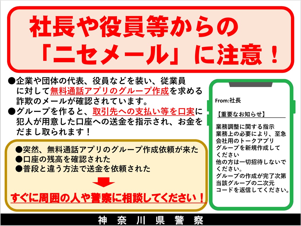 その手口の一例としては、企業や団体の代表、役員などを装い、従業員に対して無料通話アプリのグループ作成を求めるメールを送り、取引先への支払い等を口実に犯人が用意した口座への送金を指示され、金銭をだまし取られるものです。